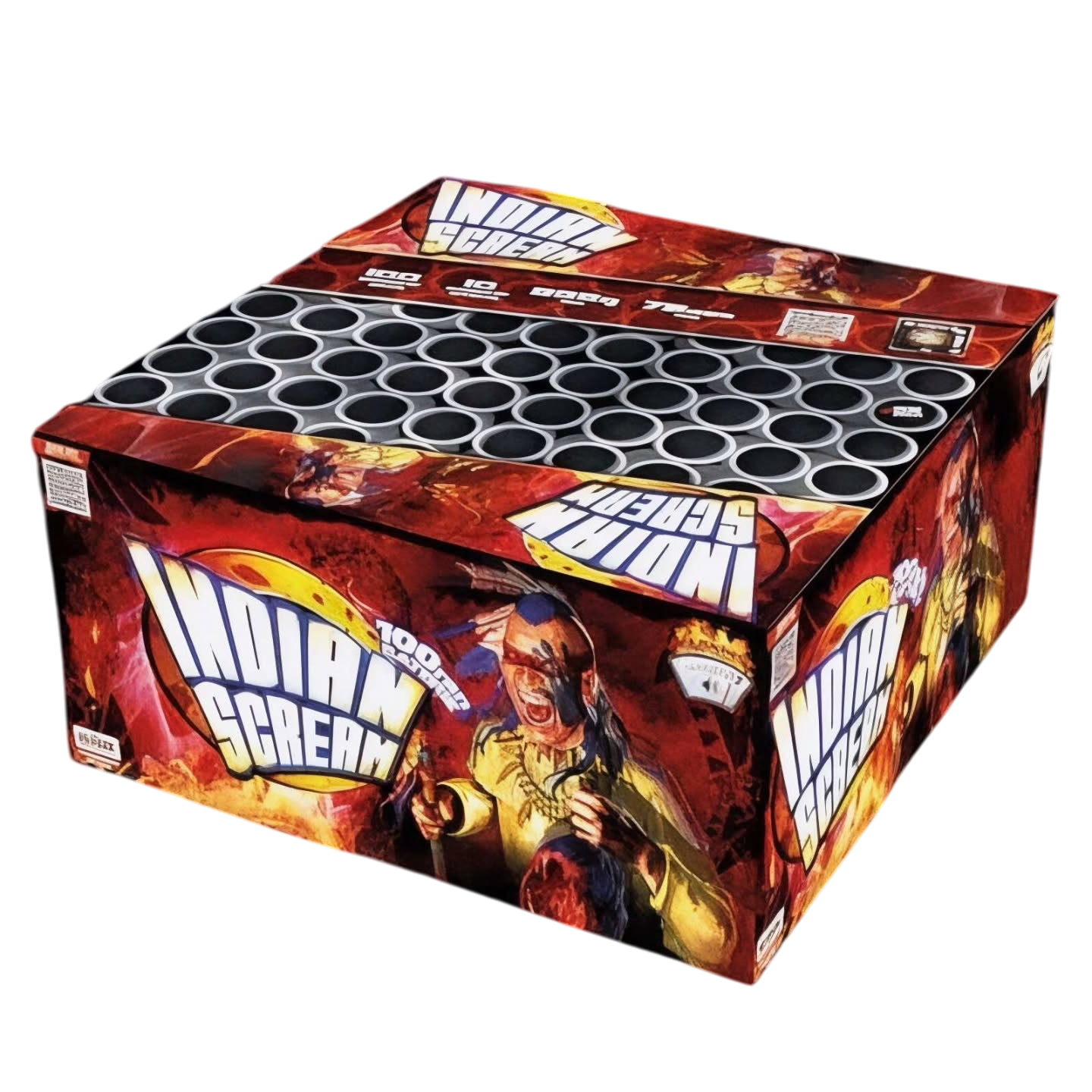Add some sparkle and wow to your firework display with Indian Scream by Klasek. The 100 shots of spectacularly large bursts, filled with gold and a rainbow of vibrant colours. So, get ready to wow your guests with the explosive beauty of a piece.